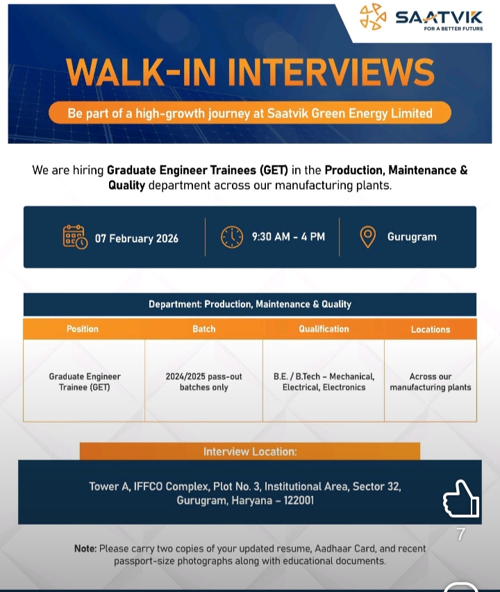 Saatvik Green Energy Limited ne Graduate Engineer Trainee (GET) ke liye Walk-in Interview announce kiya hai. Ye opportunity un candidates ke liye hai jo Production, Maintenance aur Quality Department me apna career start karna chahte hain, khaaskar Renewable Energy / Solar Sector me.